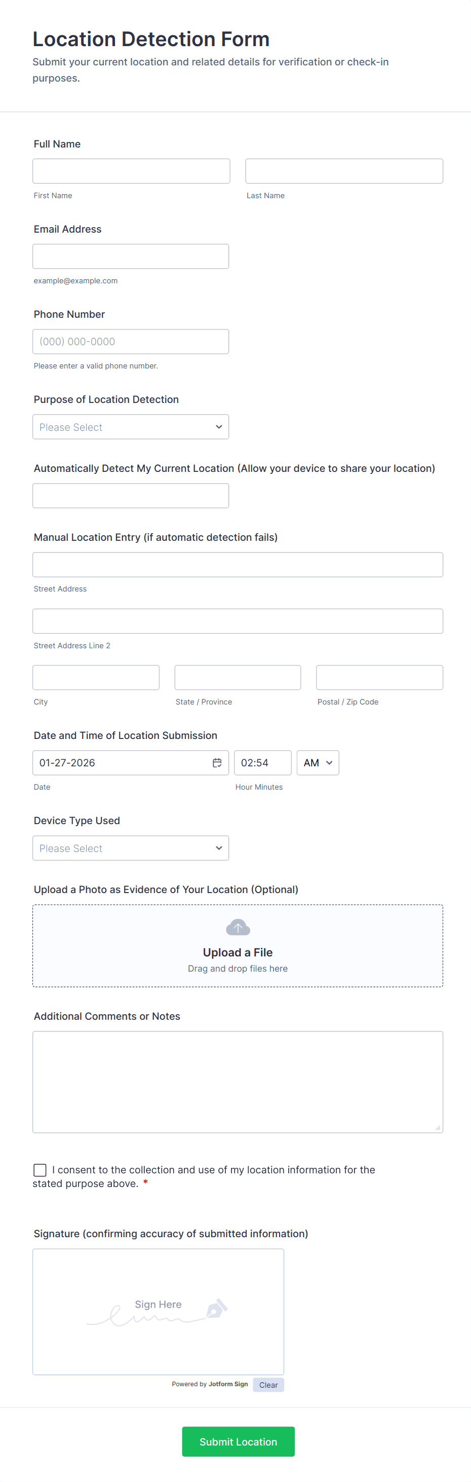 The form templates here are for informational purposes only. Jotform is not providing legal, financial, or other advice, or implying that the forms are legally valid in all or any jurisdictions. Before using any such form, consult an attorney and/or other applicable professionals to make sure that the form meets your needs, legally and otherwise.