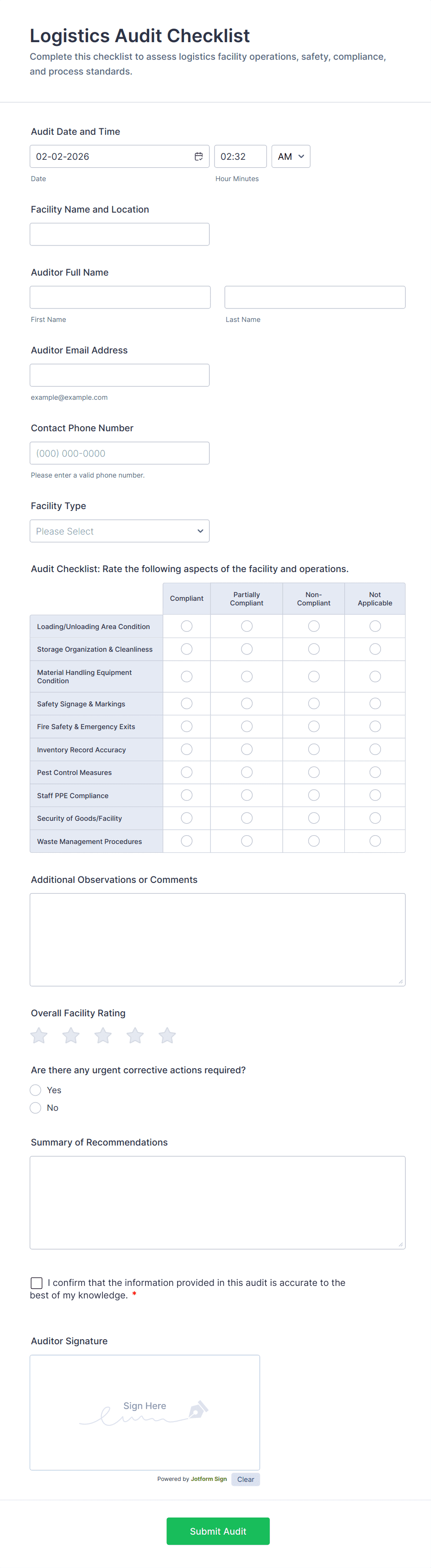 Common fields include auditor details, date and location, checklist items, compliance ratings, comments, corrective actions, signatures, and supporting documentation.