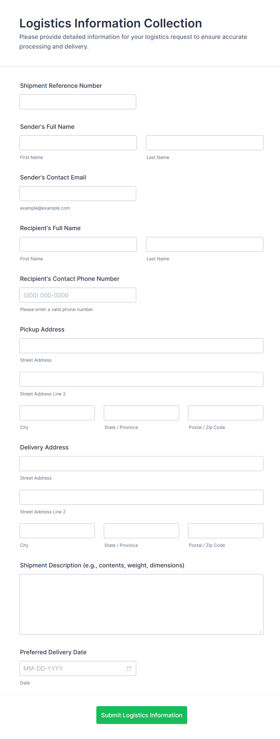 - Inventory Tracking: Forms may include fields for item name, SKU, quantity, location, and restock dates.