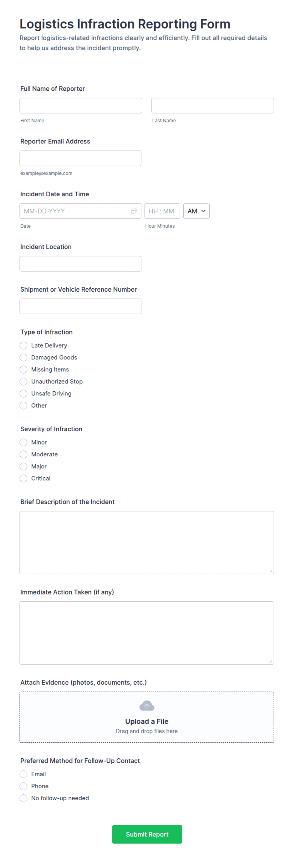 - Cargo damage and service disruption incident forms prioritize shipment or route identifiers, impact details (delays, loss), customer or stop information, and resolution steps taken.