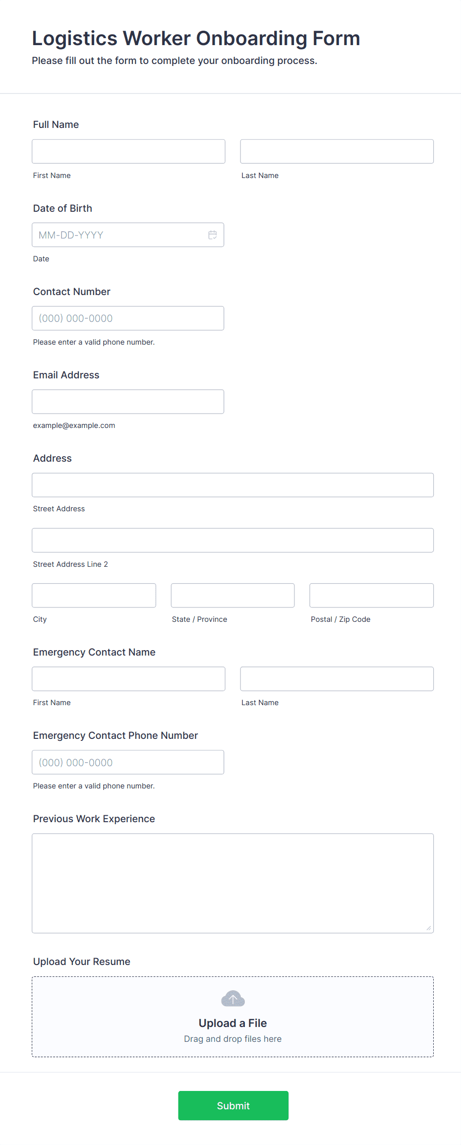 • For job applications, include fields for personal information, education, work experience, references, and file uploads for resumes or cover letters.