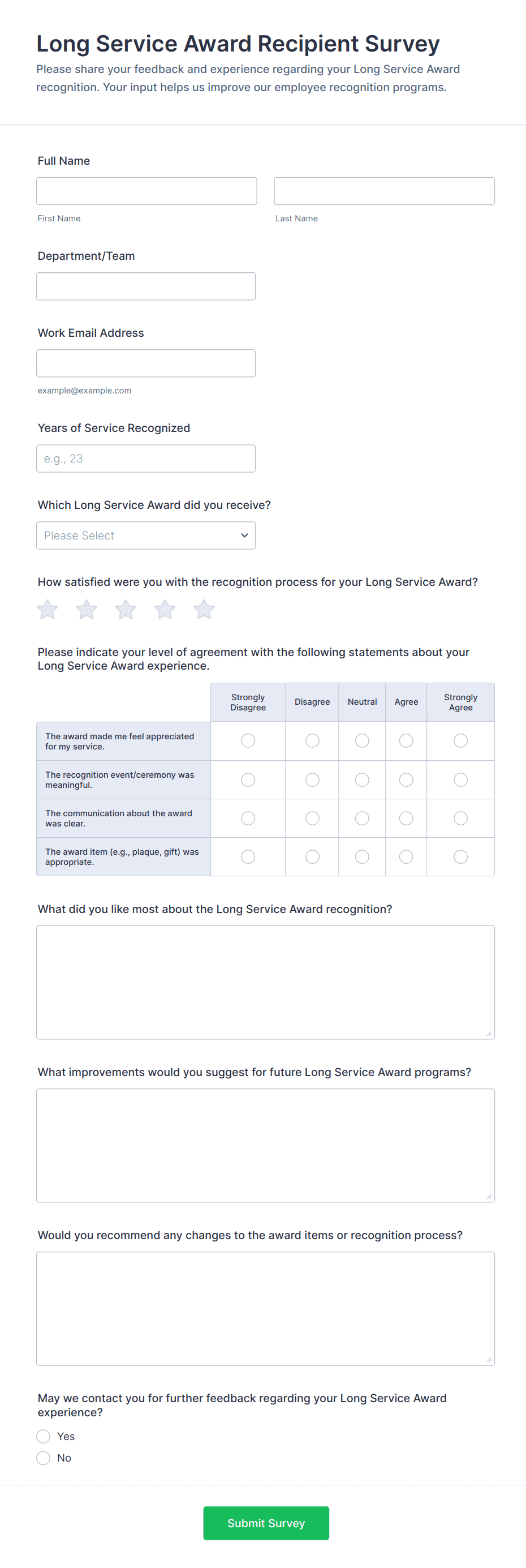 • For onboarding or exit surveys, add fields about the hiring process, training, or reasons for leaving.