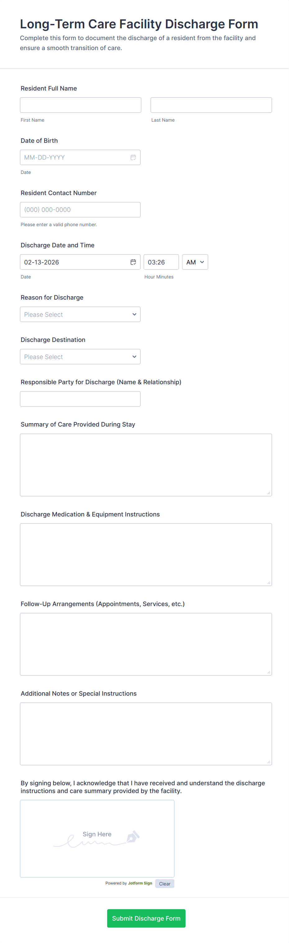 - For a healthcare discharge form, include fields such as patient name, date of discharge, diagnosis, treatment summary, medication instructions, follow-up appointments, and patient acknowledgment.