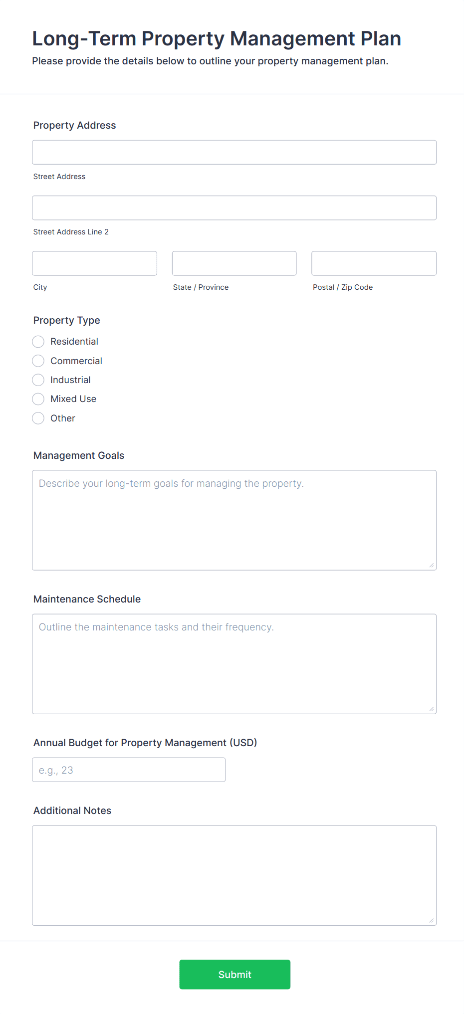 The Property Management Intake Form helps property managers collect essential information from potential tenants and property owners, streamlining the onboarding process and data collection.