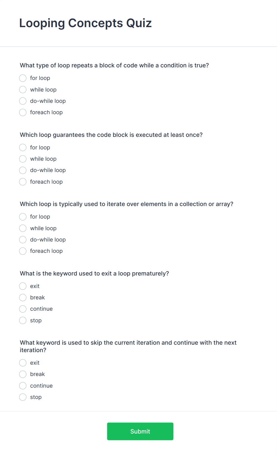 Quiz Templates are pre-designed forms specifically created to facilitate the process of building quizzes for a variety of purposes, such as education, employee training, lead generation, event engagement, and more. These templates provide a structured way to present questions, collect answers, and automatically score or evaluate responses. Whether you’re a teacher assessing student knowledge, a business running a product knowledge test, or a marketer creating a fun personality quiz, Quiz Templates offer a flexible foundation to suit your needs. They can be used for online exams, trivia games, onboarding assessments, customer feedback quizzes, and interactive learning modules.