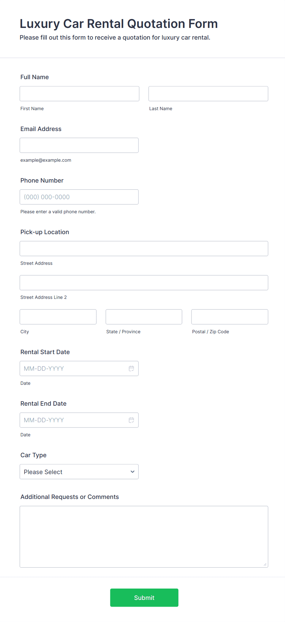 - For event or rental bookings, include fields for payment integration (PayPal, Stripe, etc.) and terms & conditions checkboxes.