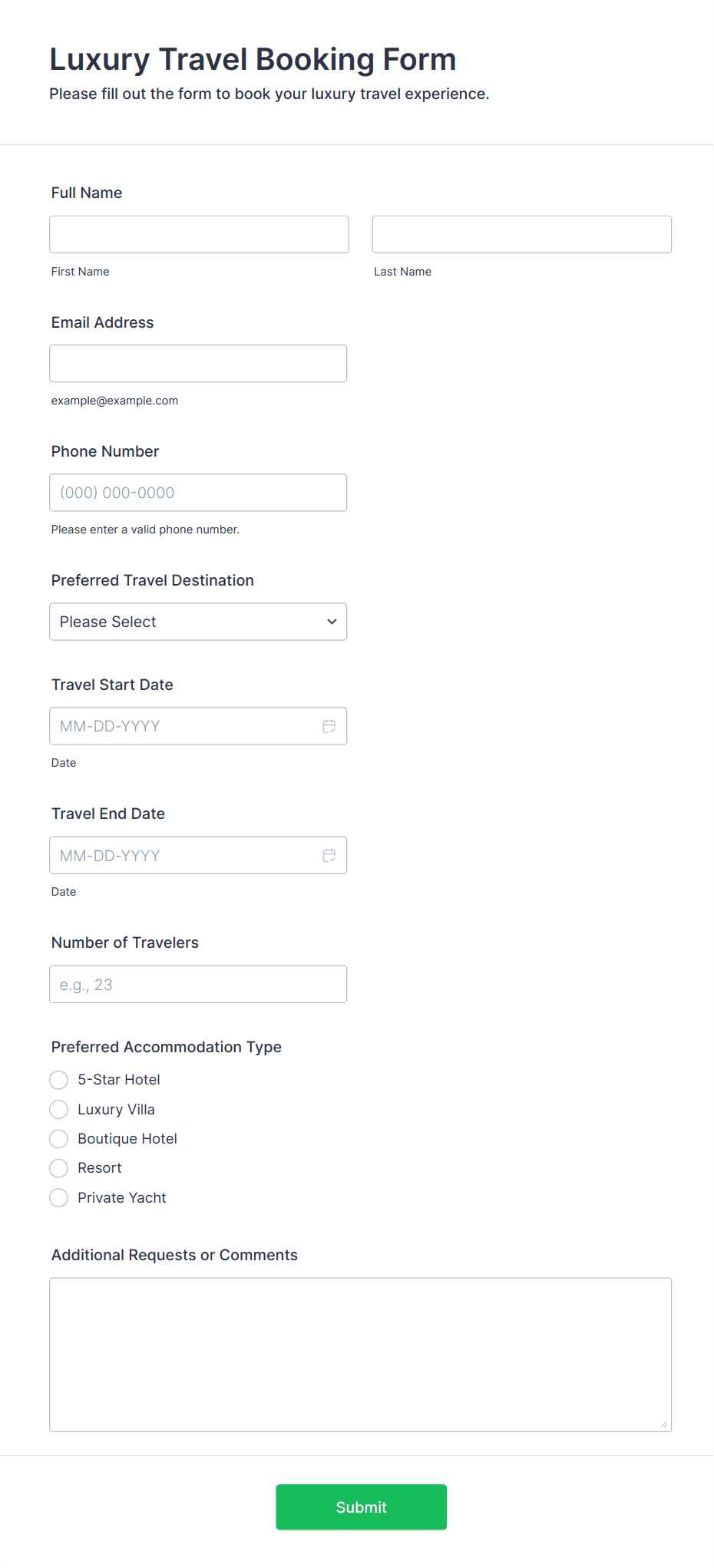 Booking forms are digital tools designed to streamline the process of scheduling appointments, reserving services, or booking resources. They are commonly used across a variety of industries, including hospitality, healthcare, education, event management, and personal services. Whether you’re managing hotel room reservations, client appointments, event registrations, or equipment rentals, booking forms help automate the intake of essential information, reduce manual errors, and ensure a smooth experience for both service providers and customers. Typical use cases include booking consultations, reserving meeting rooms, scheduling classes, or securing tickets for events.