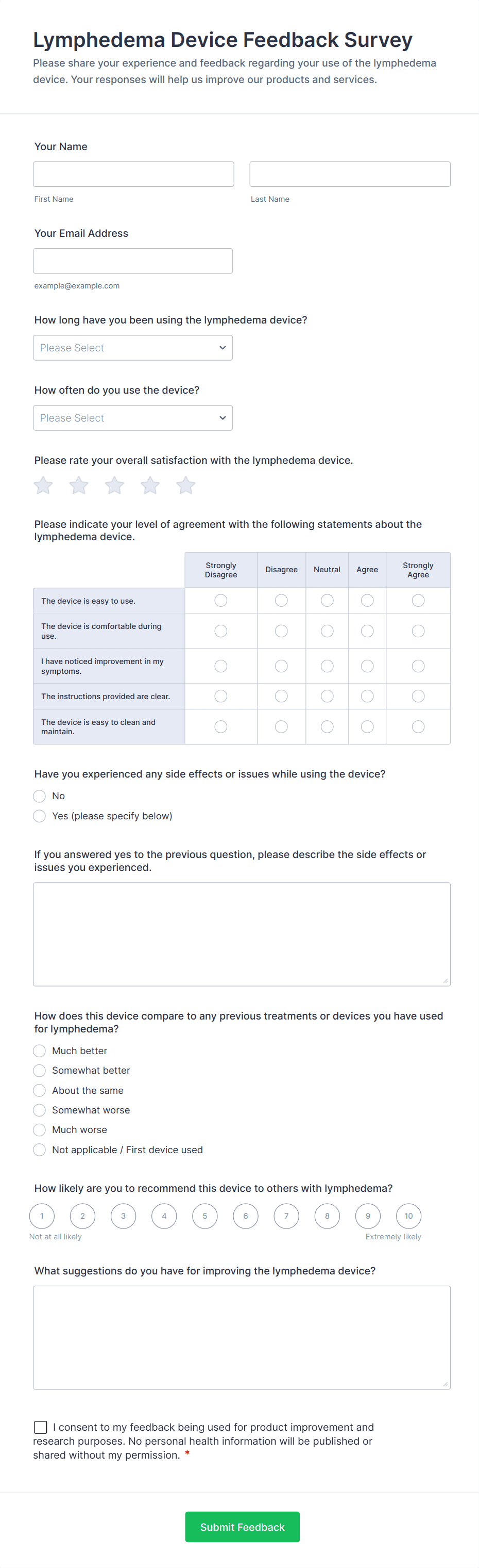 Medical surveys and questionnaires are essential tools used by healthcare professionals, researchers, clinics, and organizations to collect valuable information about patients’ health, medical histories, symptoms, treatment outcomes, and overall well-being. These forms can be used for a variety of purposes, such as patient intake, health risk assessments, satisfaction surveys, mental health screenings, post-visit feedback, and clinical research studies. By gathering structured data directly from patients or study participants, medical surveys and questionnaires help streamline workflows, improve patient care, and support evidence-based decision-making in healthcare settings.