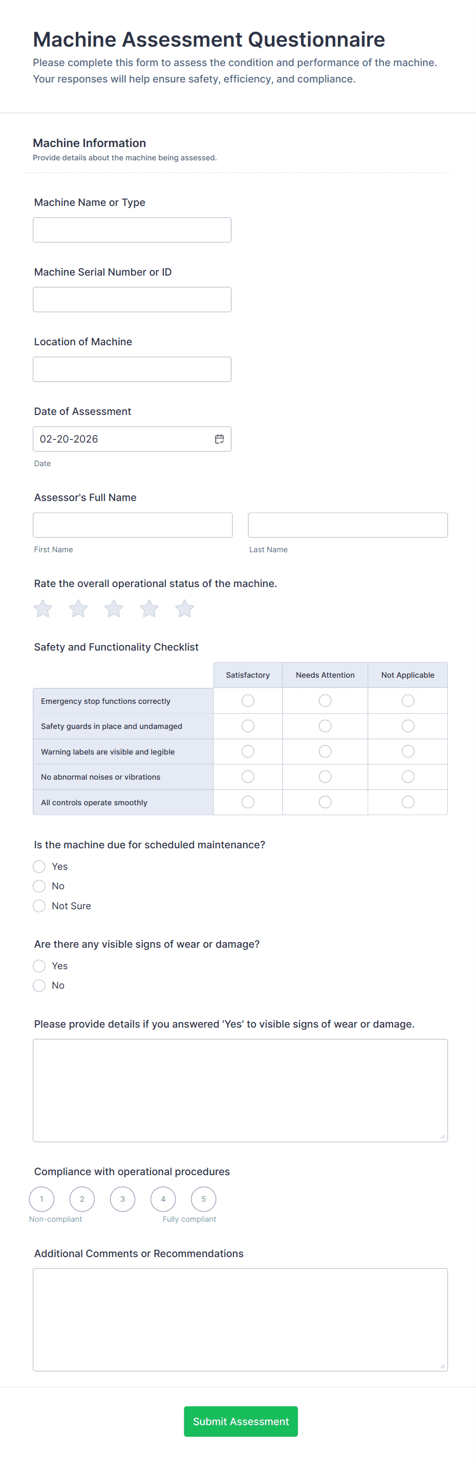 Track equipment upkeep with the Machine Maintenance Checklist Form for consistent data collection across sites, helping technicians and supervisors document inspections, replacements, and outcomes with every form submission in Jotform.