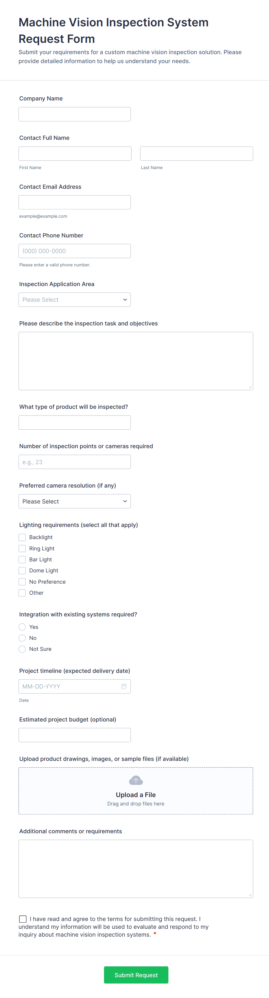 Collect requester name, role, department, and contact info so requests can be routed and fulfilled correctly.