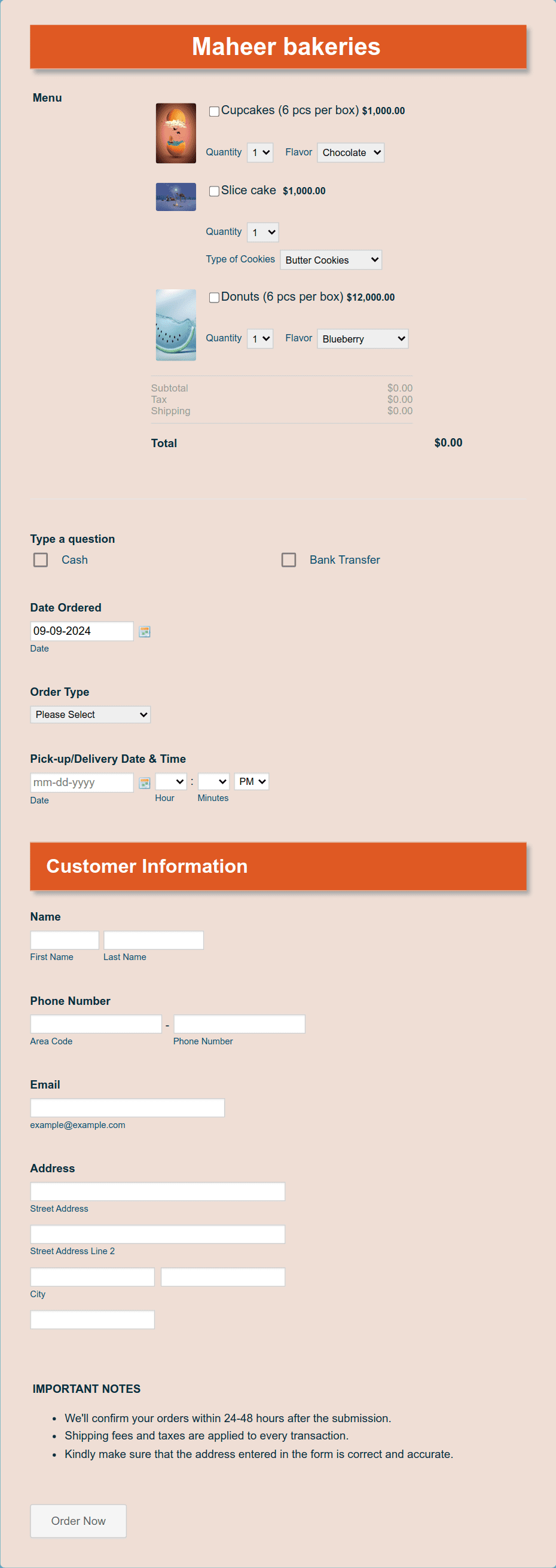 Enhance your order process by using this Bakery Products Order Form template. This will surely improve the customer experience of your bakery shop both online and offline orders.