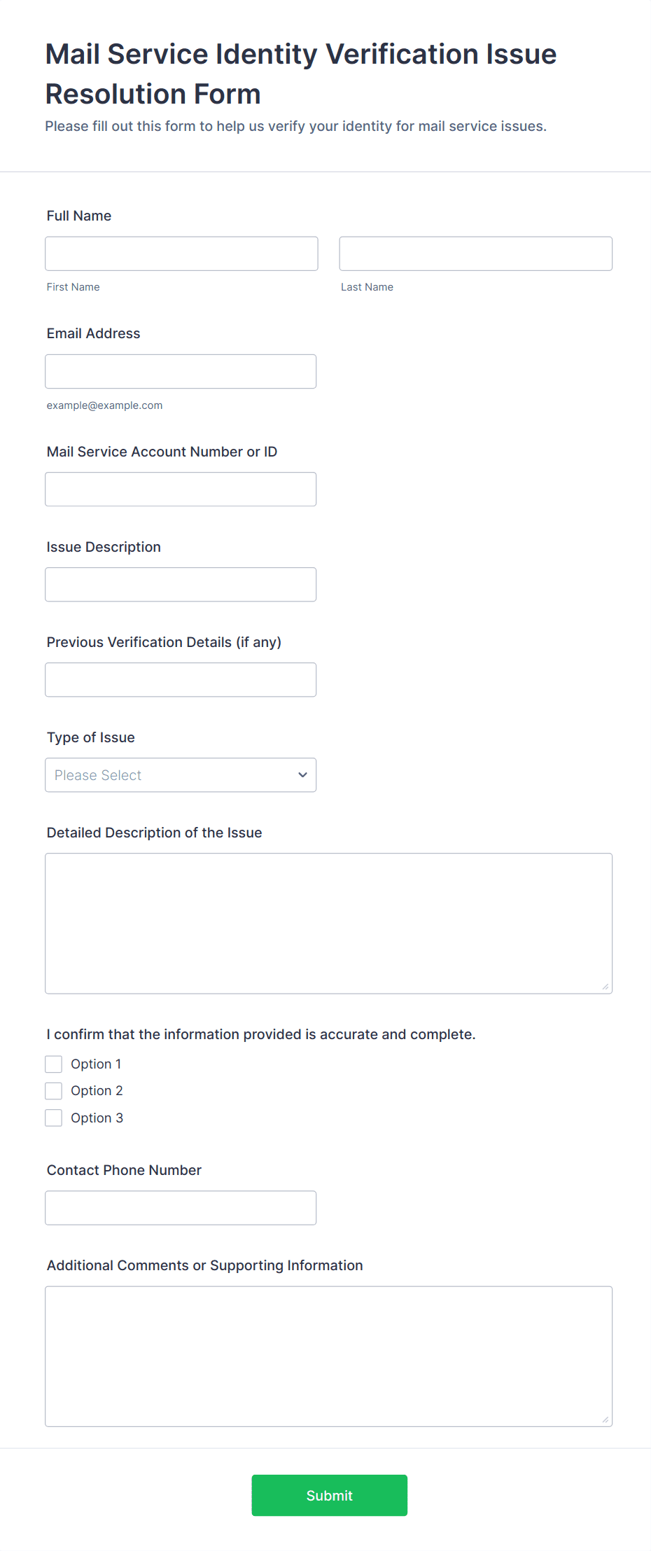 Verification forms are specialized digital tools designed to authenticate, validate, or confirm information provided by individuals or organizations. These forms are commonly used to verify identities, credentials, employment status, addresses, or other critical data points in a secure and efficient manner. Typical use cases include onboarding new employees, confirming student enrollment, validating customer identities for financial services, or ensuring the accuracy of submitted documents in compliance processes. By streamlining the verification process, these forms help organizations reduce fraud, maintain regulatory compliance, and build trust with their stakeholders.
