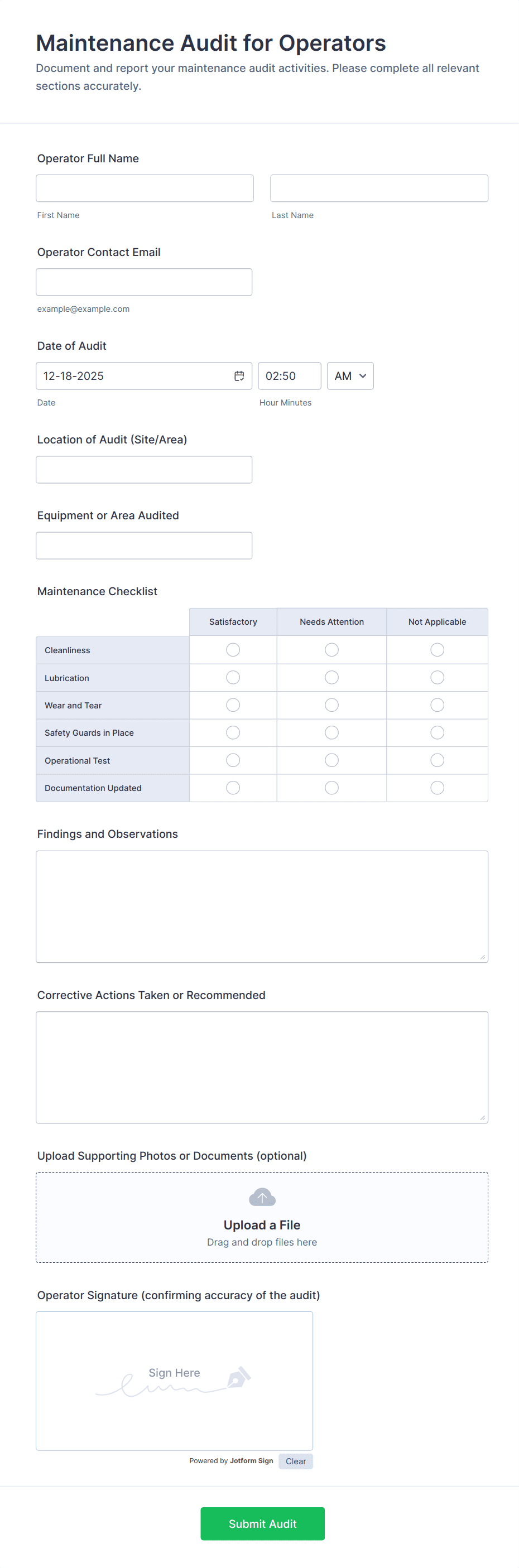 Machinery Maintenance Checklist Form