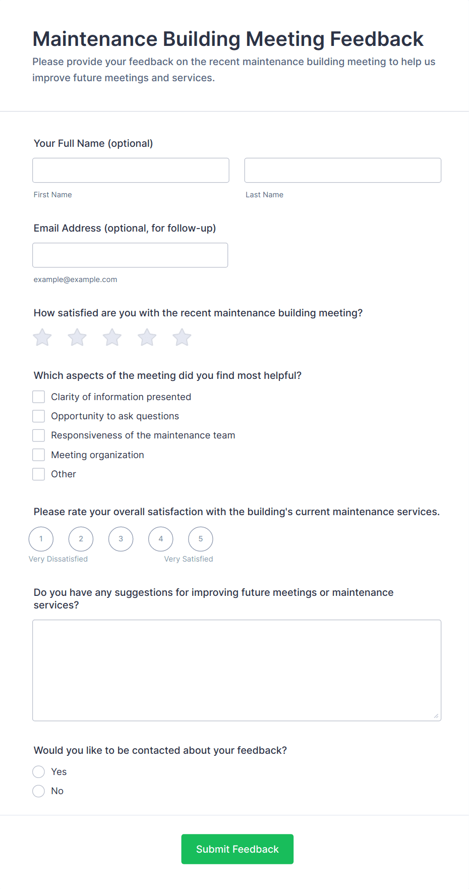 Do you want to get a feedback about the meeting from your clients? This meeting feedback template allows gathering name, email, comment.