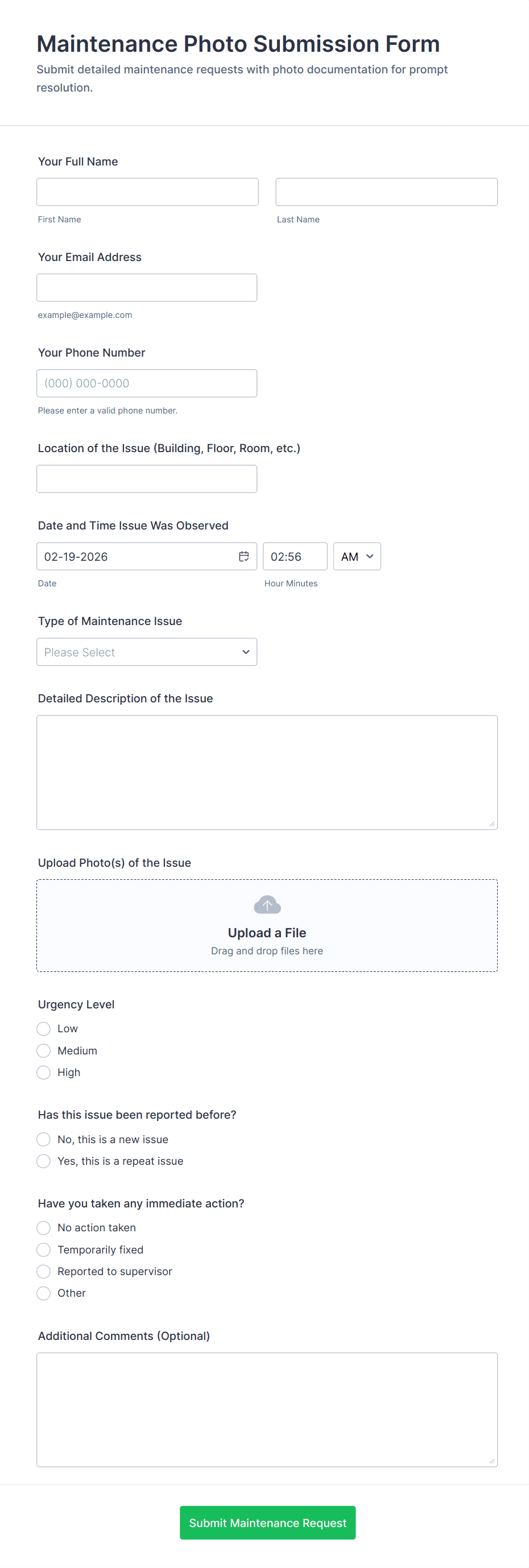 A maintenance request form is used by both property owners and building managers to identify maintenance issues and submit service requests. Easy to use. No coding.