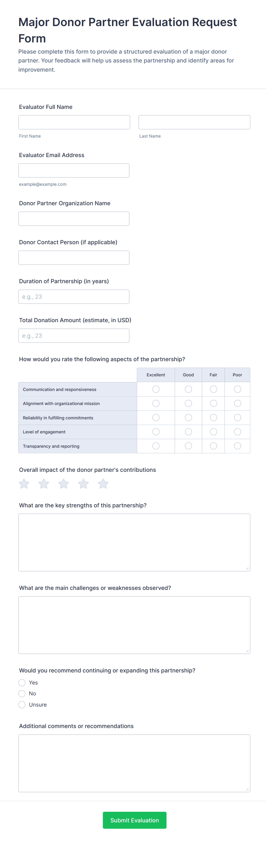 An evaluation form is a structured document or online tool used to collect feedback, assess performance, or measure satisfaction in various settings such as workplaces, schools, events, or customer interactions.