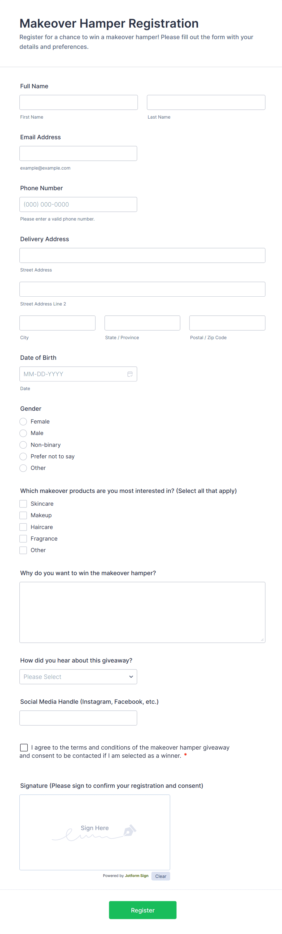 - Social Media Giveaways: May include fields for social handles, sharing proof, or referral tracking.
