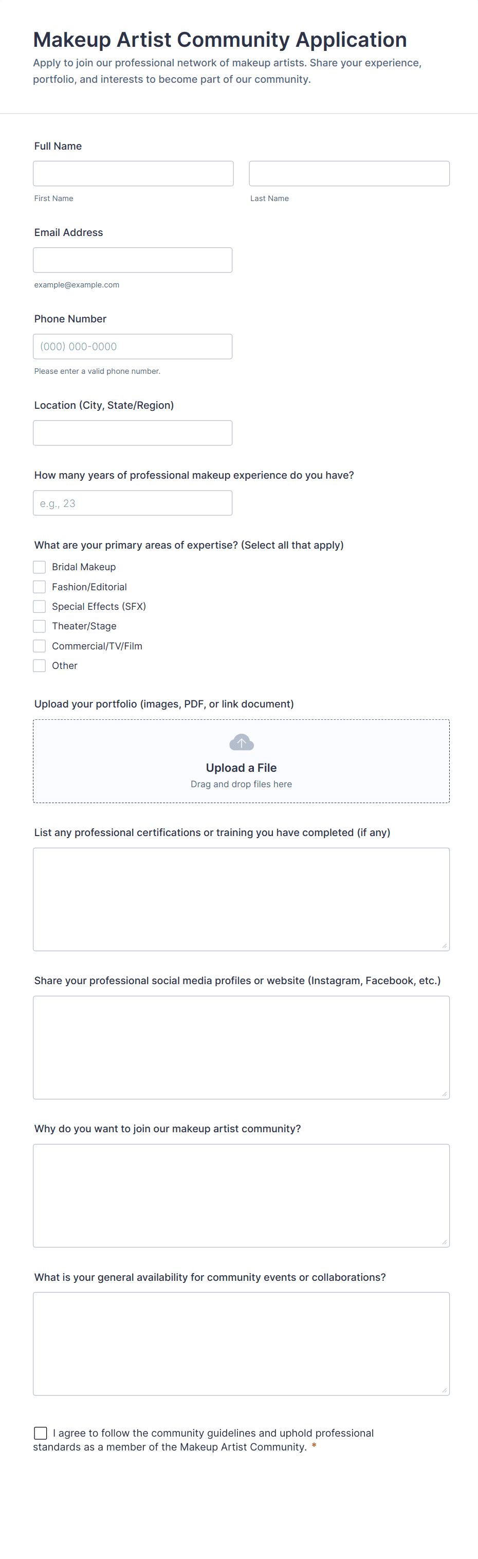 A Community Membership Application Form is a form template designed to streamline the membership application process for community administrators or organizers.