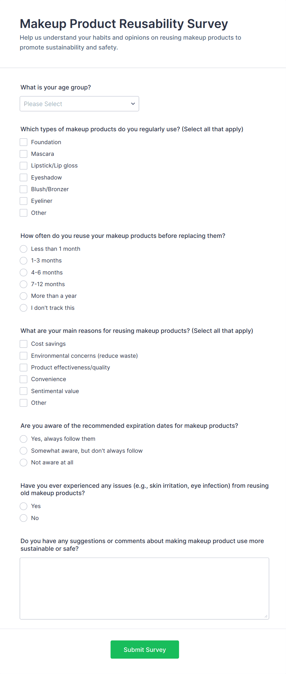 Collect feedback with a Skin Care Product Feedback Form and improve your skincare product based on feedback collected from the customers. No code required!