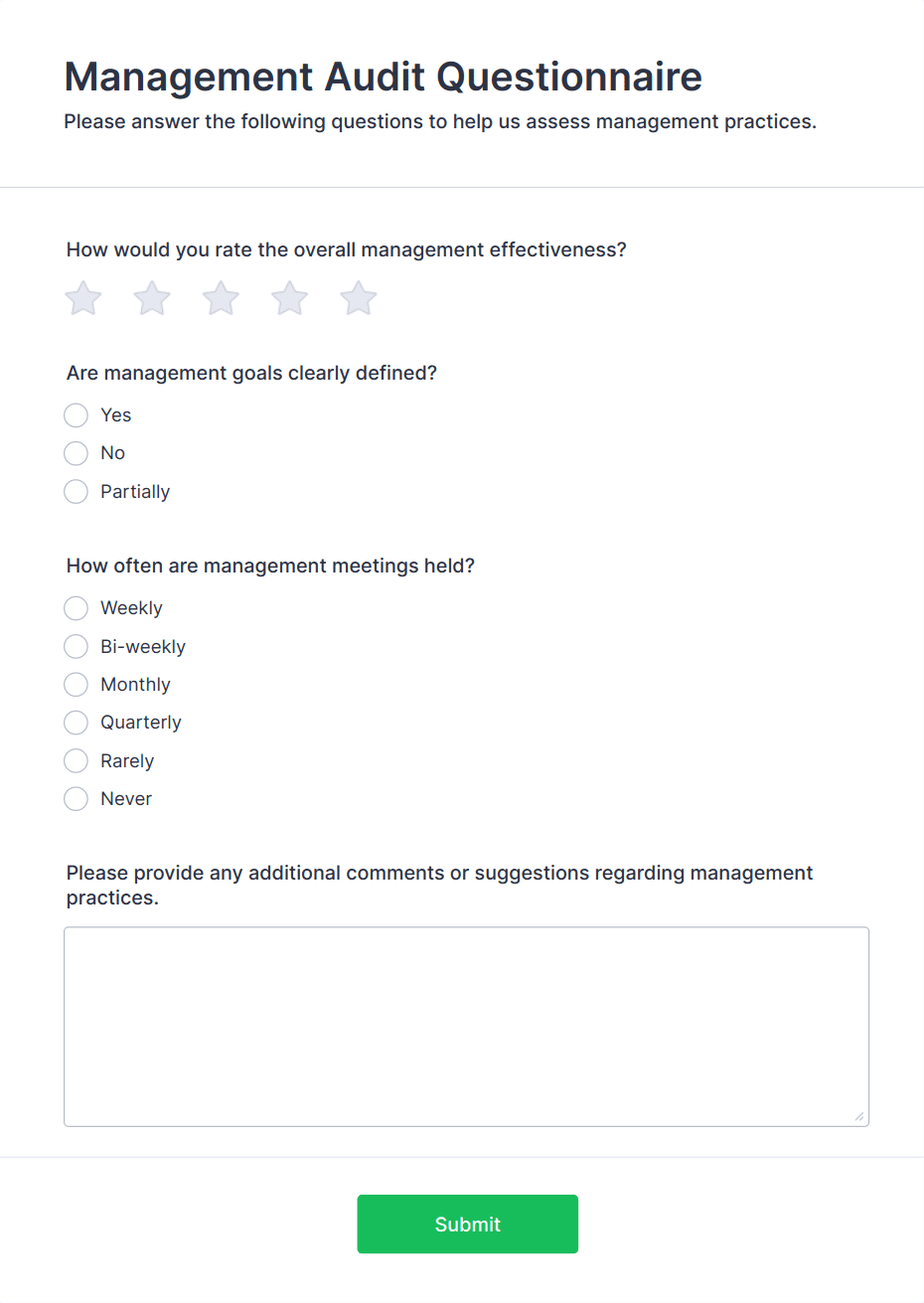 Audit forms are used by safety officers, quality managers, compliance teams, auditors, facility managers, HR professionals, and other stakeholders responsible for oversight and evaluation.
