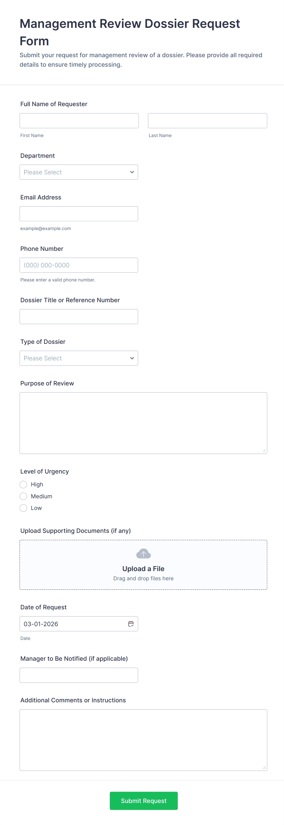 A request form is a structured document or online form used to collect information from individuals who need to ask for a service, resource, approval, or support. It standardizes the way requests are submitted and managed.