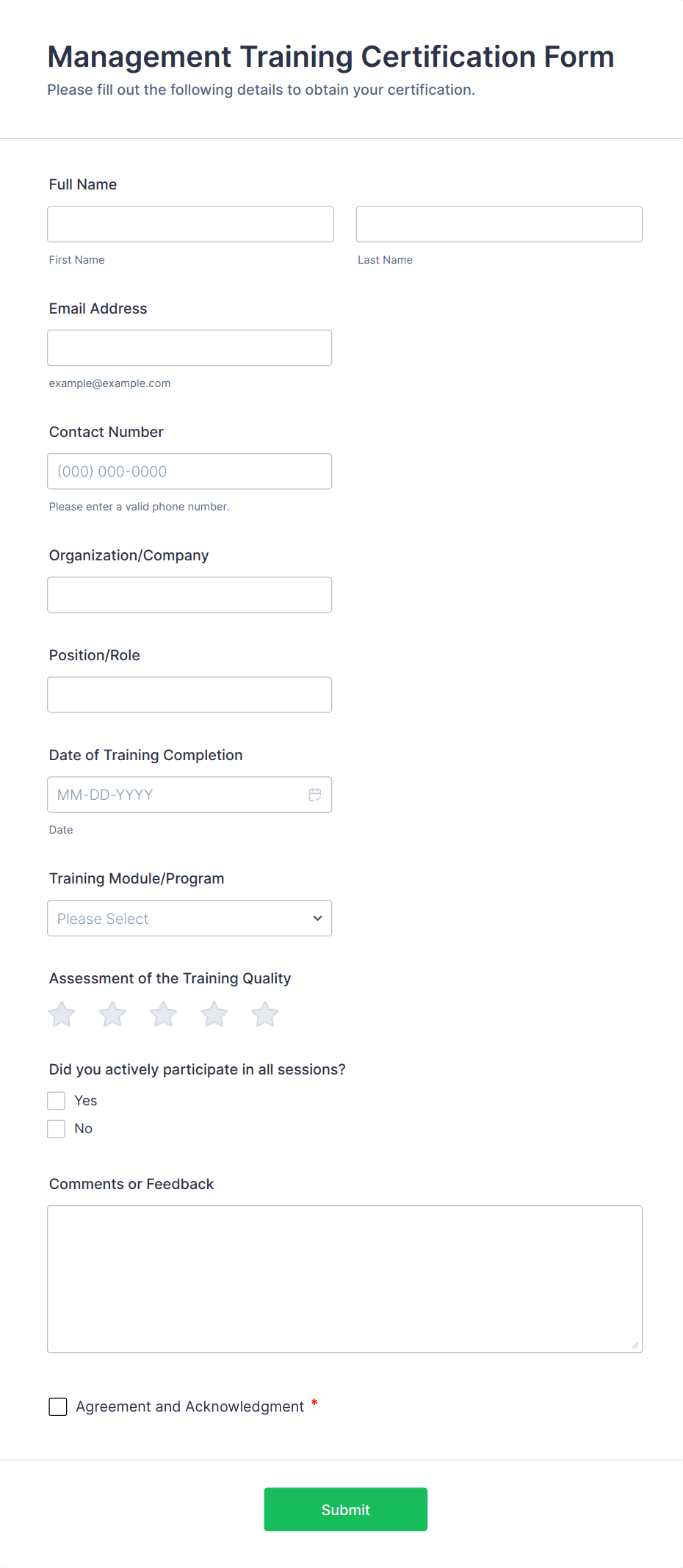 Training forms are specialized digital documents designed to streamline the process of organizing, managing, and evaluating training programs. These forms can be used for a variety of purposes, such as employee onboarding, skills assessments, training feedback, course registrations, pre-training surveys, and post-training evaluations. Organizations of all sizes — from corporate HR departments to educational institutions and training consultants — rely on training forms to collect essential information, track participant progress, and ensure that learning objectives are met efficiently.