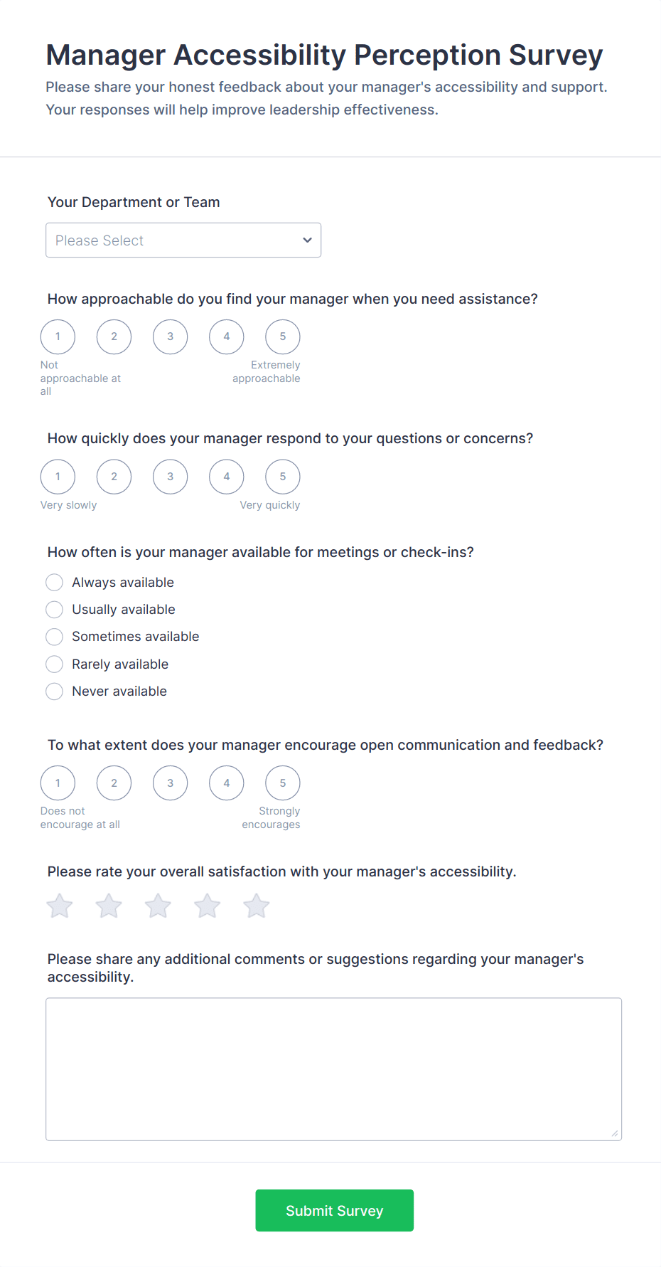 The Manager Feedback Responsiveness Survey is a Jotform Form Builder template that uses a drag-and-drop interface for easy data collection and form submission to evaluate how managers respond to employee needs.