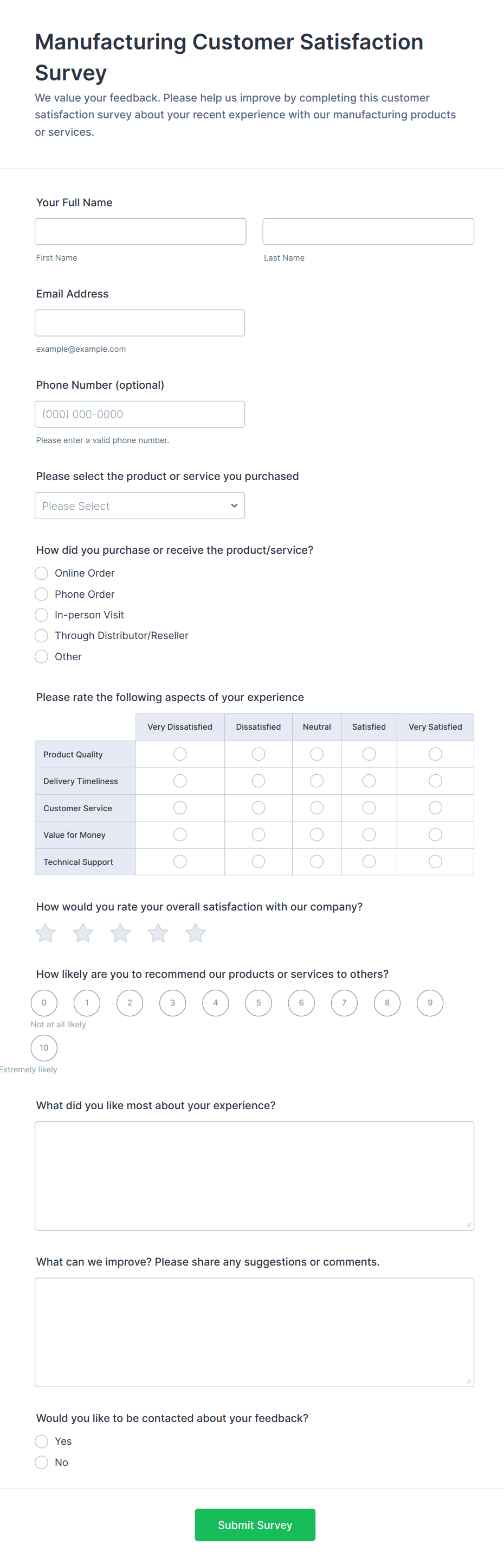 Manufacturing forms are online forms used to collect manufacturing information like product and supply orders, inventory reports, feedback, applications, and more. With these ready-made Manufacturing Forms from Jotform, you can save time and paper by switching from messy paper forms to efficient only forms you can fill out on any device.
