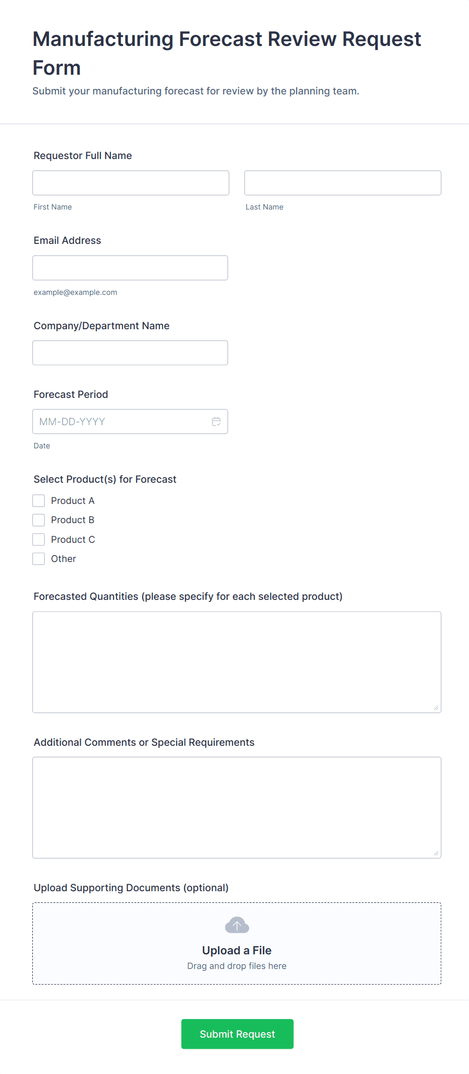 A manufacturing form is a digital or paper-based document used to collect, track, and manage data related to production, quality control, maintenance, inventory, and safety within a manufacturing environment.