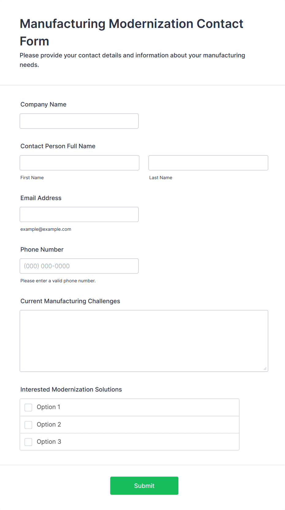 • Sales or quote request forms could ask for company details, budget, and specific service interests.