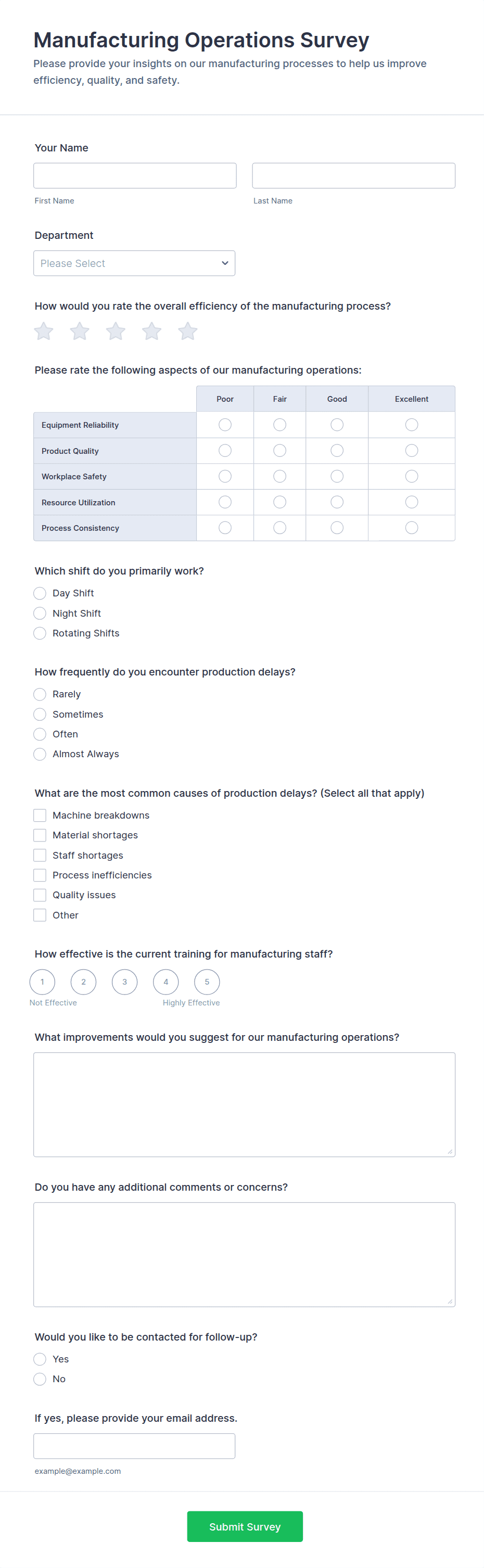 A manufacturing form is a digital or paper-based document used to collect, track, and manage data related to production, quality control, maintenance, inventory, and safety within a manufacturing environment.