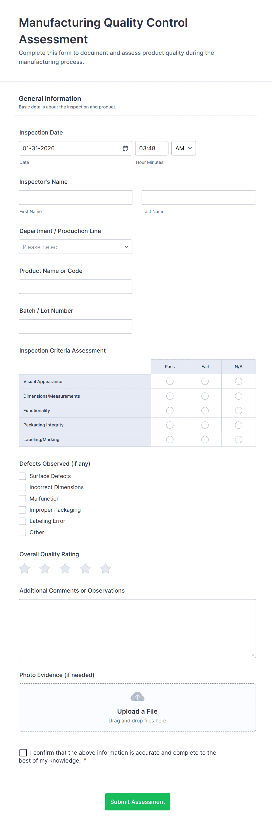 A manufacturing form is a digital or paper-based document used to collect, track, and manage data related to production, quality control, maintenance, inventory, and safety within a manufacturing environment.
