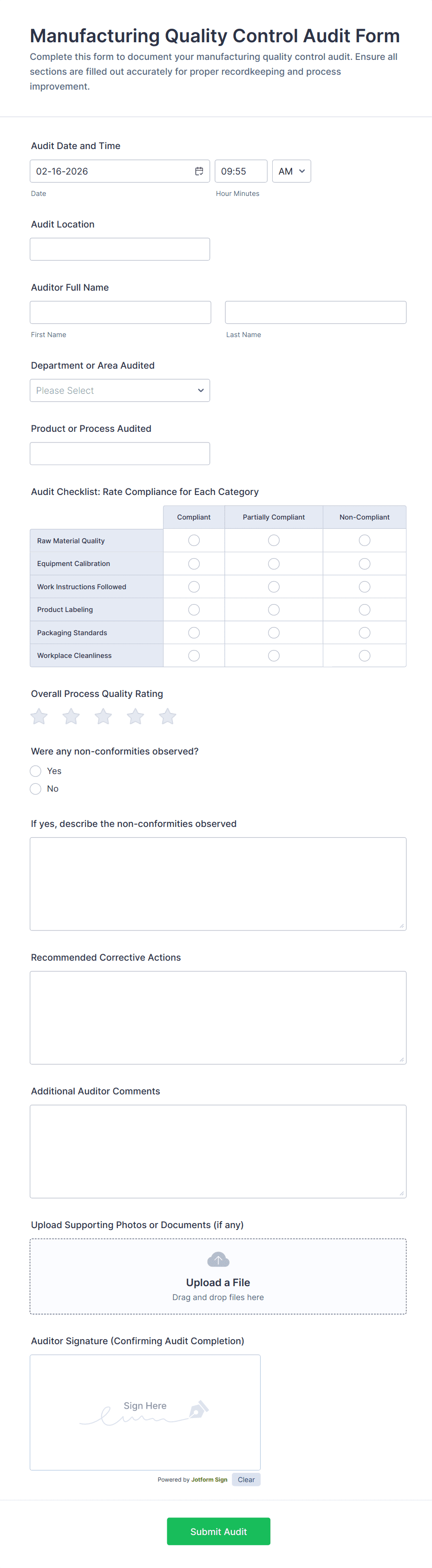 Audit Form is a form template designed to streamline and simplify the audit process in any sector. It's the perfect solution to conduct thorough inspections, track data, and ensure full regulatory compliance.