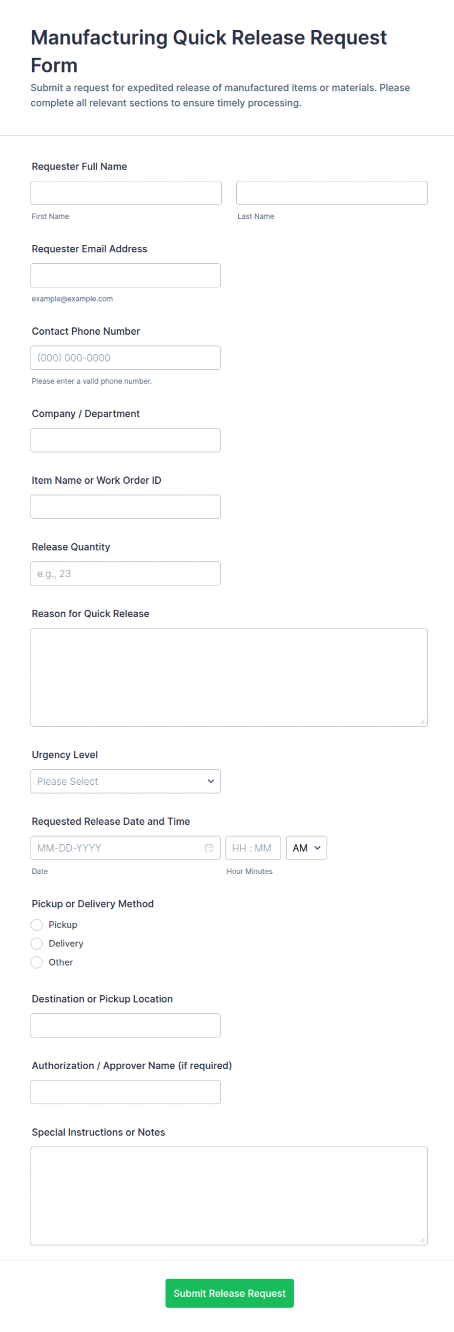 A manufacturing form is a digital or paper-based document used to collect, track, and manage data related to production, quality control, maintenance, inventory, and safety within a manufacturing environment.