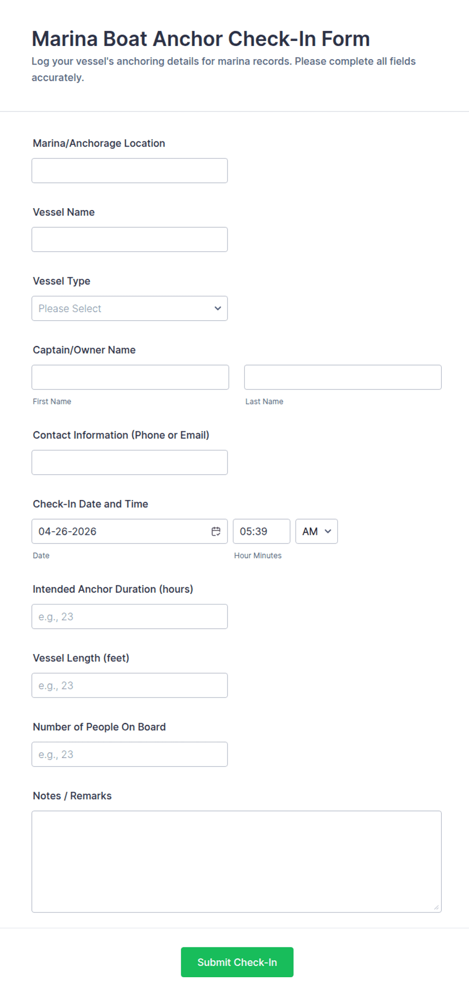 Check-In Form Templates are digital forms designed to streamline the process of recording arrivals and departures for a variety of settings, such as events, appointments, workplaces, schools, hotels, and healthcare facilities. These templates help organizations efficiently track attendance, monitor visitor flow, and collect essential information from guests, employees, or participants. Whether you’re managing a conference, coordinating patient visits, or overseeing daily employee attendance, check-in forms provide a structured and professional way to gather and organize data, ensuring a smooth and secure check-in experience for everyone involved.