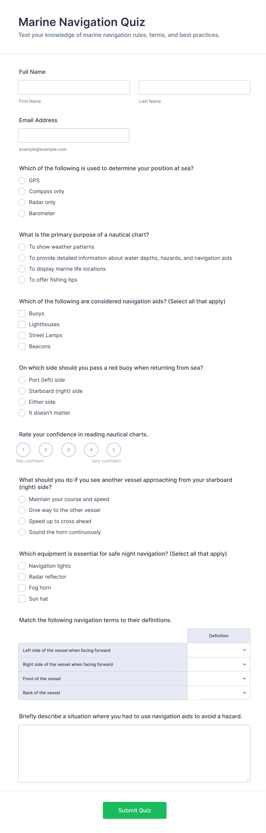 Quiz Templates are pre-designed forms specifically created to facilitate the process of building quizzes for a variety of purposes, such as education, employee training, lead generation, event engagement, and more. These templates provide a structured way to present questions, collect answers, and automatically score or evaluate responses. Whether you’re a teacher assessing student knowledge, a business running a product knowledge test, or a marketer creating a fun personality quiz, Quiz Templates offer a flexible foundation to suit your needs. They can be used for online exams, trivia games, onboarding assessments, customer feedback quizzes, and interactive learning modules.