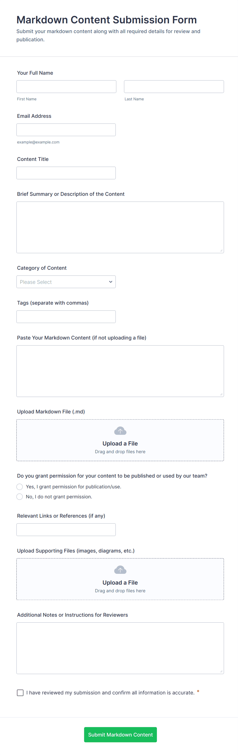 Content Forms are specialized online forms designed to facilitate the collection, submission, and management of various types of content. These forms are commonly used for gathering articles, blog posts, creative writing, multimedia files, user-generated content, feedback, and editorial submissions. Organizations, publishers, marketing teams, and educators often rely on Content Forms to streamline the process of receiving and organizing content from contributors, freelancers, or the public. Whether you’re running a magazine, managing a content marketing campaign, or collecting student assignments, Content Forms help ensure that submissions are structured, complete, and easy to review.