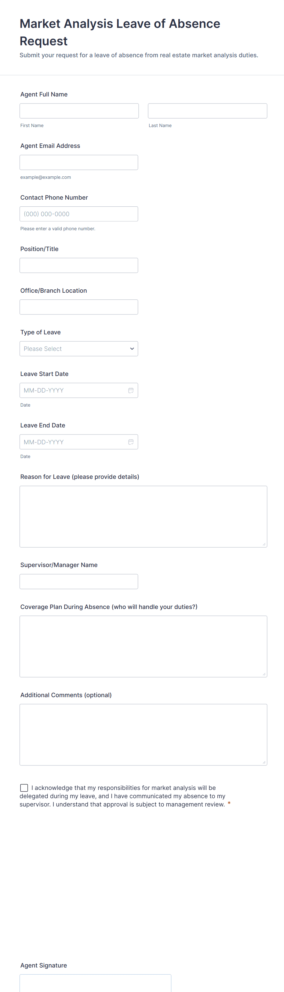 Common fields include employee name, department, type of leave, dates of absence, reason for leave, and any required supporting documentation.