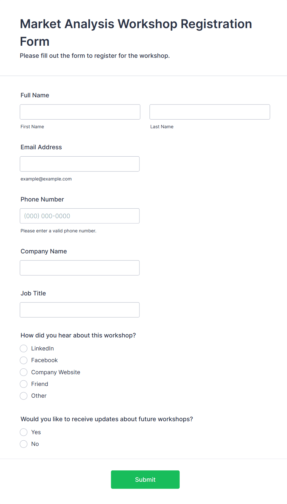 • Workshops and training sessions: Register participants, gather skill levels, and manage waitlists.