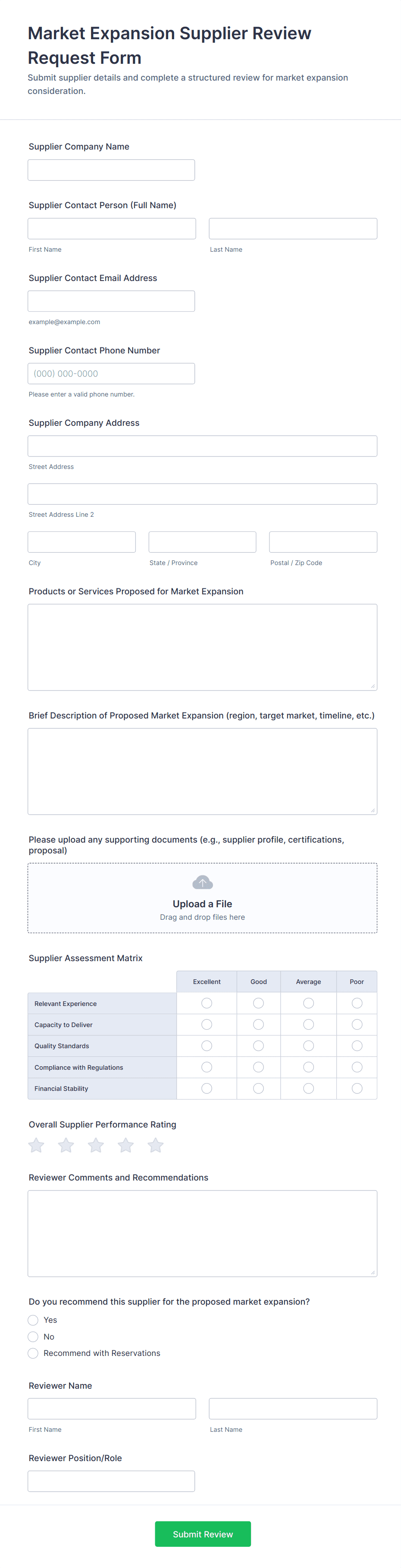 Supplier Coordination System Request Form helps procurement and operations teams collect supplier requests, prioritize follow-ups, and centralize data collection with Jotform for faster vendor communication and review.