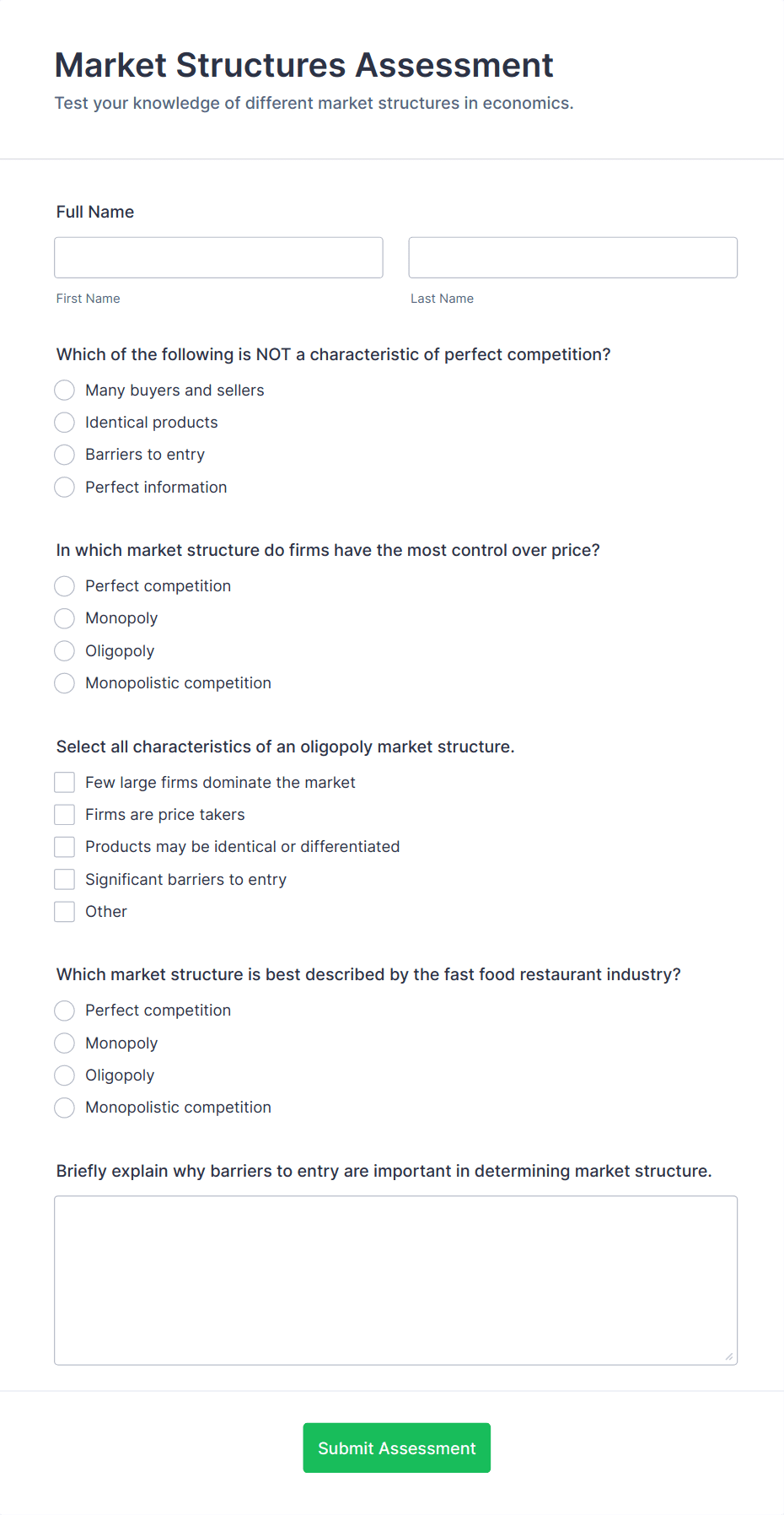 A Market Structures Assessment should include definitions, concept checks, real-world scenarios, graphs or tables to interpret, and questions that compare different structures, along with fields for student identification and class details.