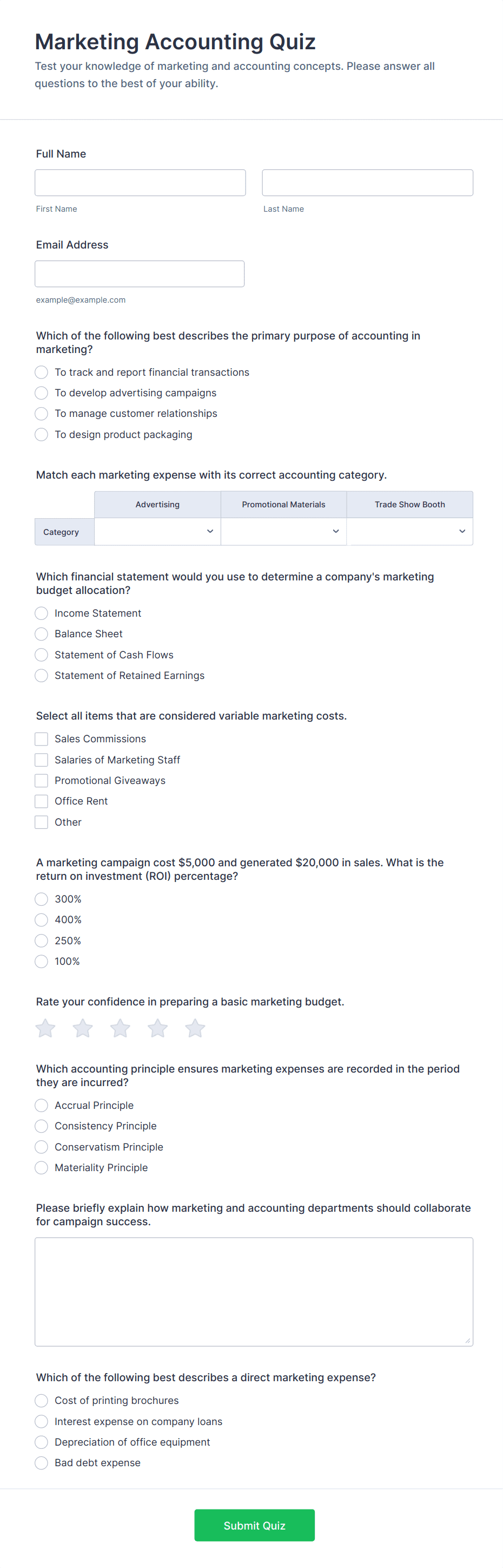Quiz Templates are pre-designed forms specifically created to facilitate the process of building quizzes for a variety of purposes, such as education, employee training, lead generation, event engagement, and more. These templates provide a structured way to present questions, collect answers, and automatically score or evaluate responses. Whether you’re a teacher assessing student knowledge, a business running a product knowledge test, or a marketer creating a fun personality quiz, Quiz Templates offer a flexible foundation to suit your needs. They can be used for online exams, trivia games, onboarding assessments, customer feedback quizzes, and interactive learning modules.