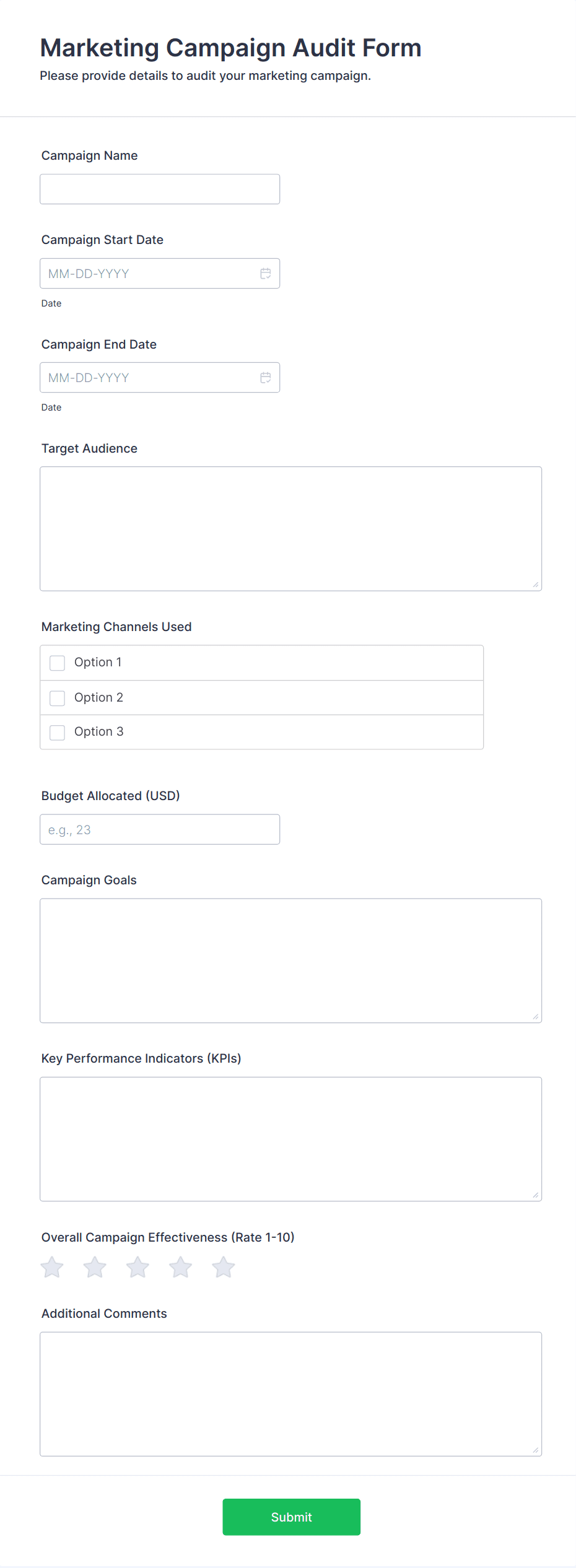 A marketing form template is a pre-designed online form used to collect information for marketing purposes, such as lead generation, event registration, customer feedback, or newsletter sign-ups.