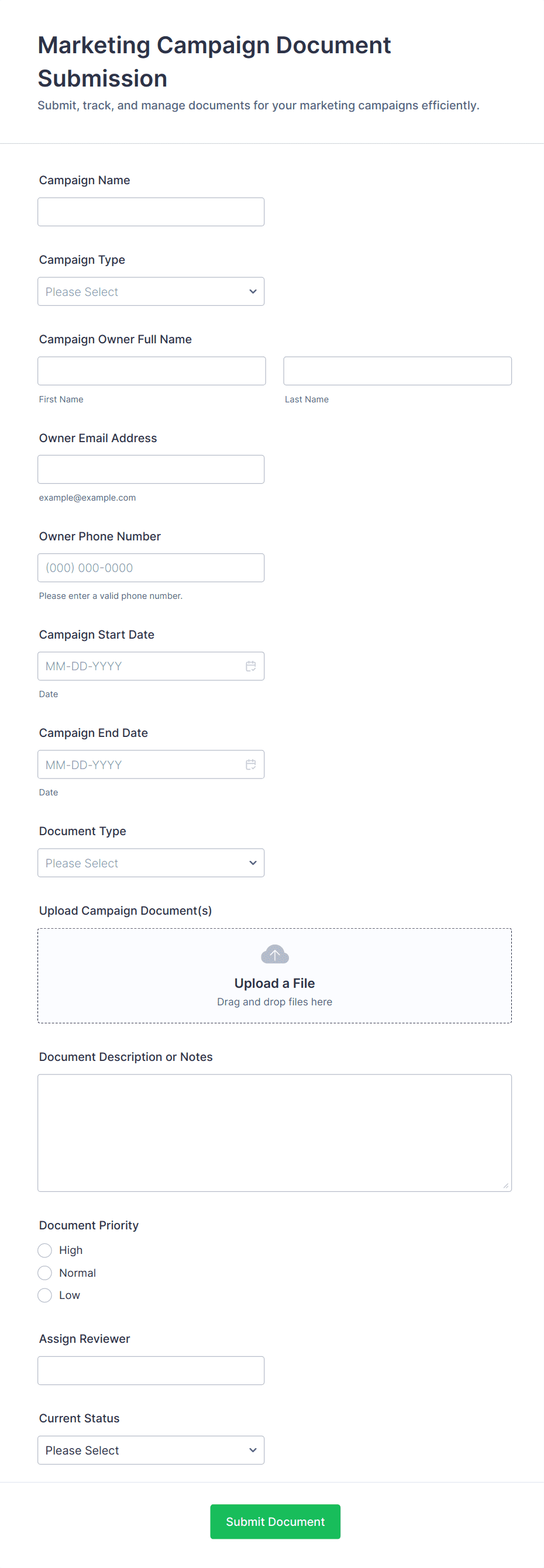 File Upload Forms are specialized online forms designed to collect files, documents, images, or other digital assets directly from users. These forms are commonly used in scenarios where individuals or organizations need to gather supporting materials, such as job applications with resumes, event registrations with ID proofs, homework submissions, design requests, or client onboarding documents. The versatility of File Upload Forms makes them essential for businesses, educational institutions, creative agencies, HR departments, and service providers who require a secure and efficient way to receive files from clients, students, or collaborators.
