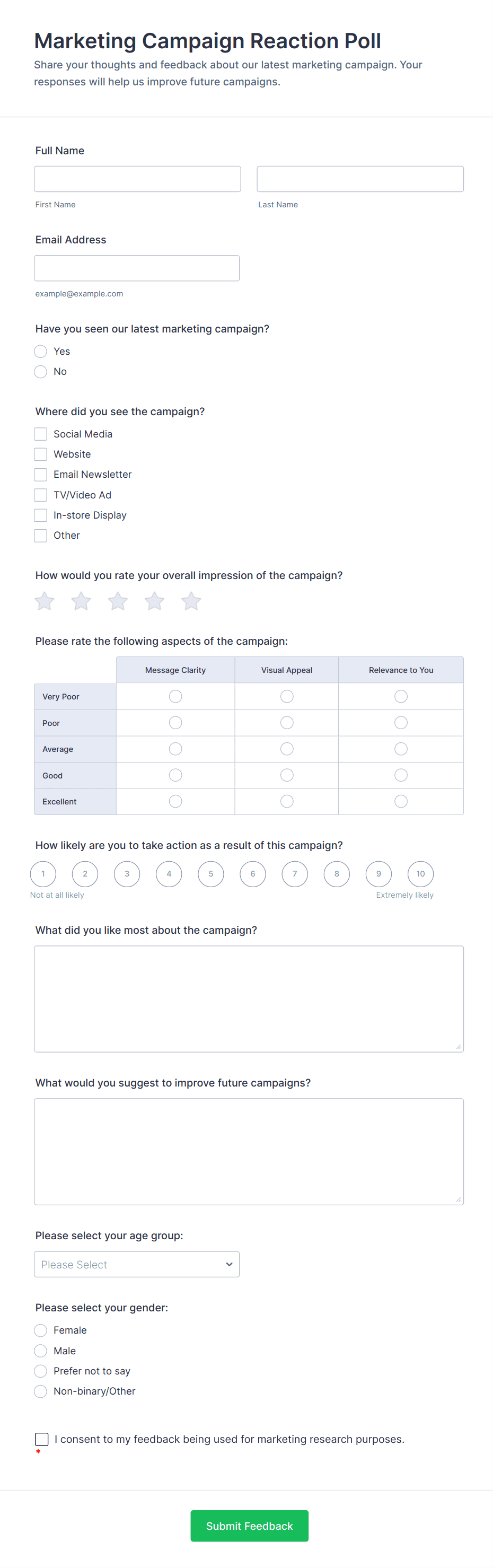 • Market Research Surveys: Understand market needs, preferences, and trends before launching new campaigns.
