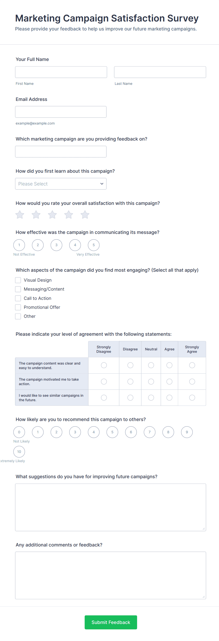 • Product Feedback: Add product-specific questions, feature checklists, and suggestion boxes.