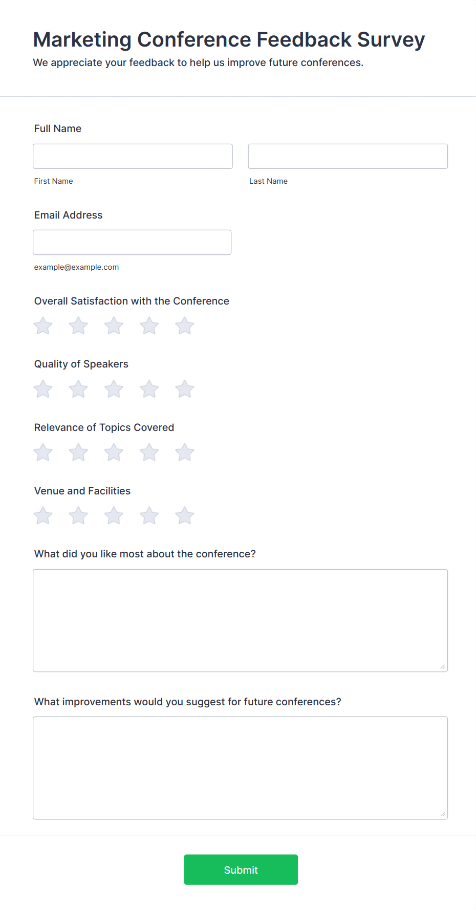 • Event Feedback Surveys: Evaluate attendee satisfaction and gather suggestions for future events.