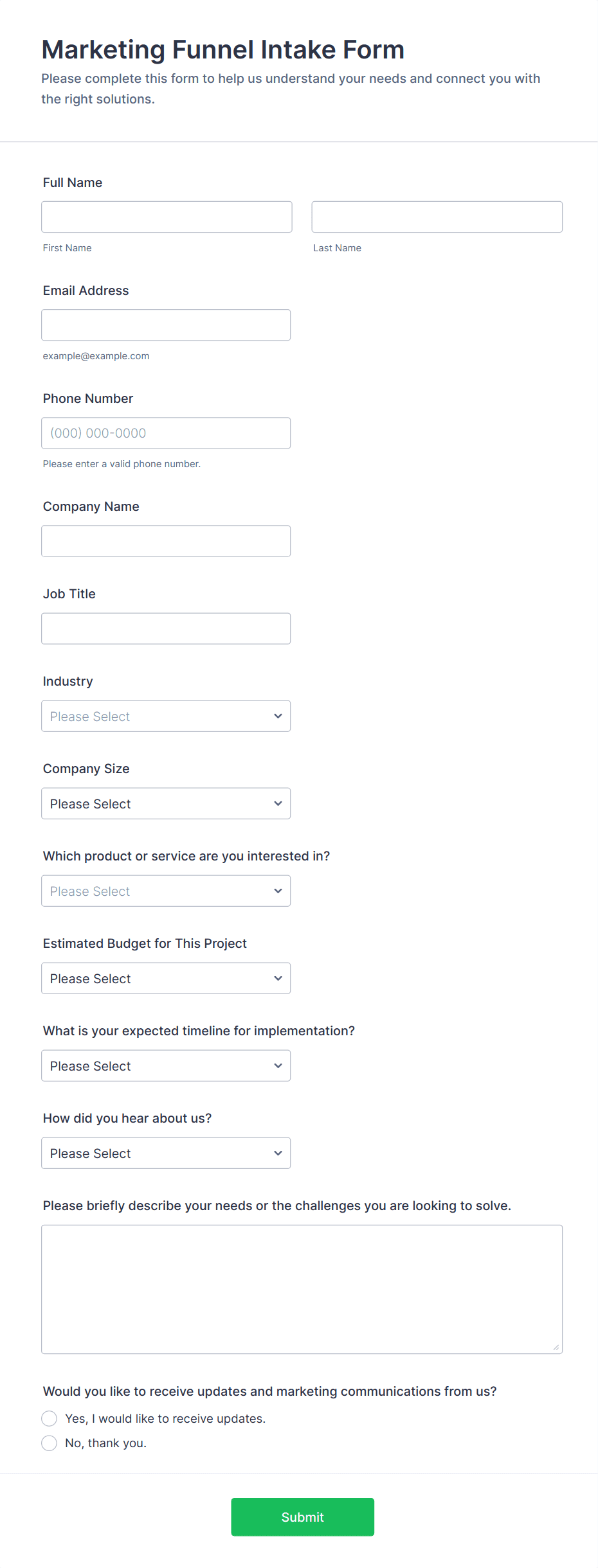 - Helps qualify leads by capturing specific information (e.g., budget, company size).