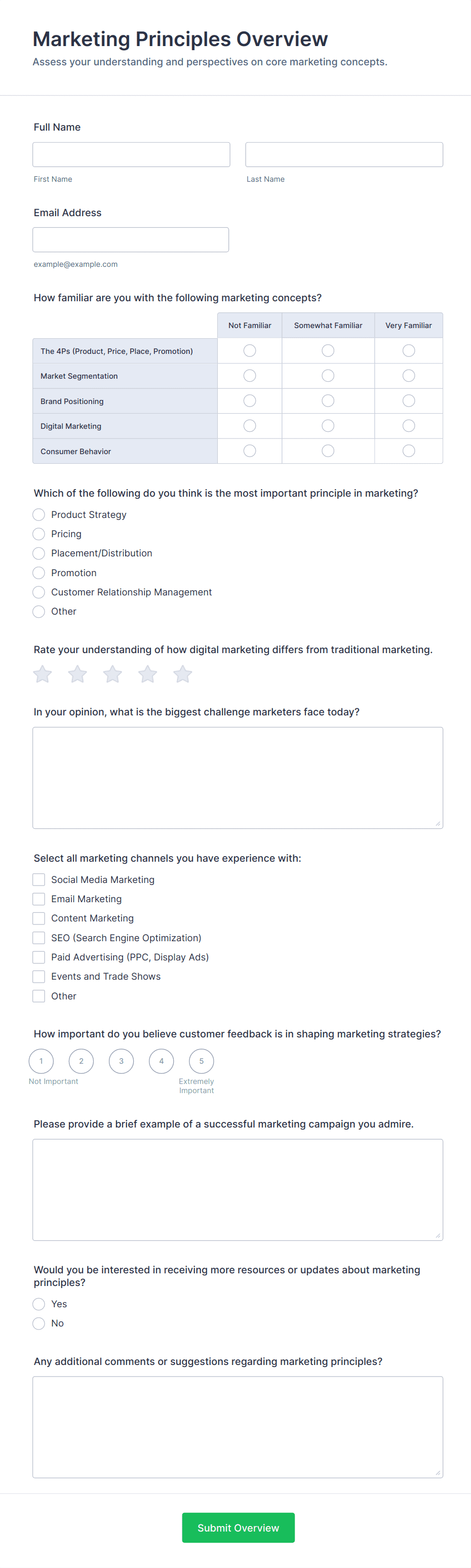 • Market Research Surveys: Incorporate demographic questions, purchasing behavior, and competitor analysis.