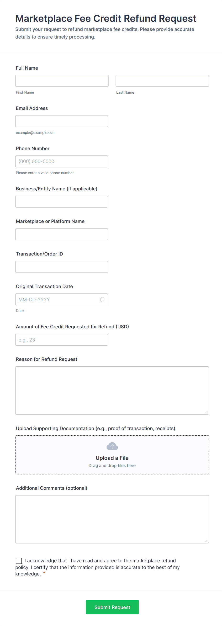 - E-commerce Refunds: May require order number, product details, reason for return, and upload fields for receipts or photos.